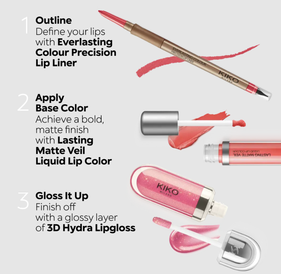 The contemporary packaging stands out with its metallic cap with the KK logo embossed on the side. The soft wand applicator is designed to accentuate the gloss’ texture and precisely outline the lips.